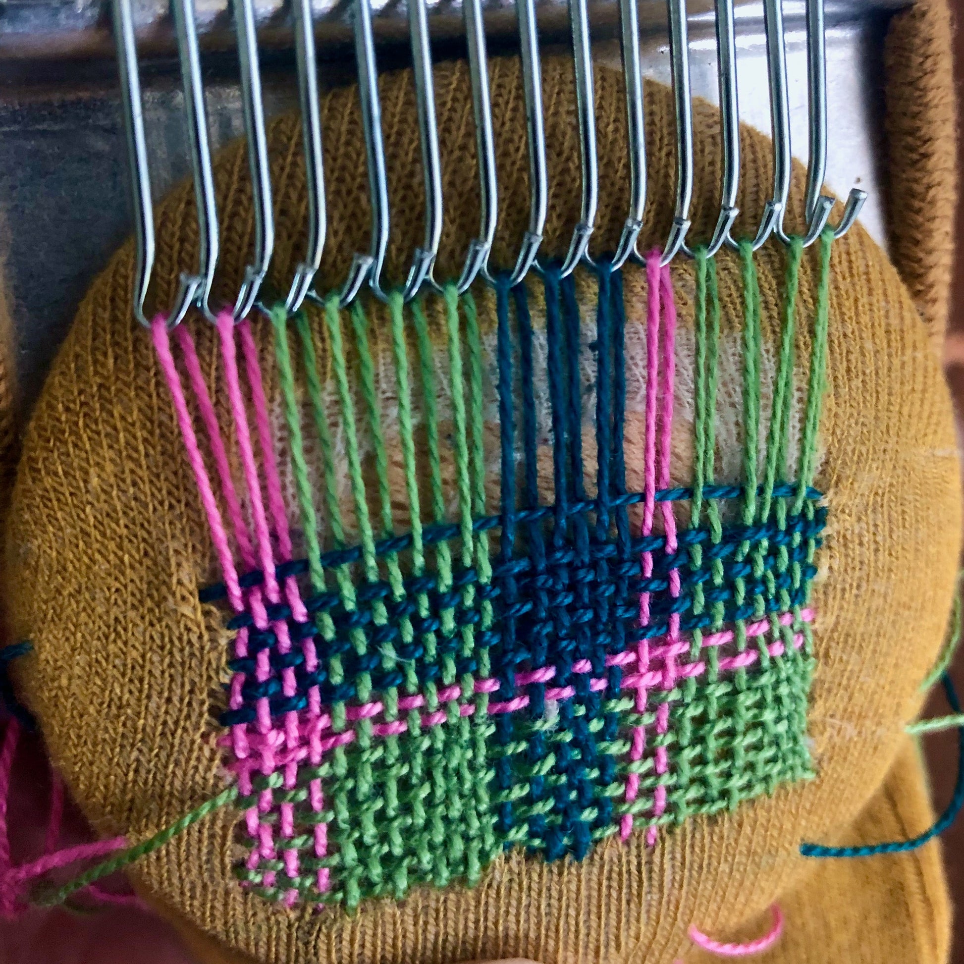 Stoffet spændes fast med en elastik, præcis som stoppedisken, så din vævning holdes stram indtil arbejdet er færdigt. Til slut syes den øverste del helt enkelt fast til stoffet og de løse ender syes ind.